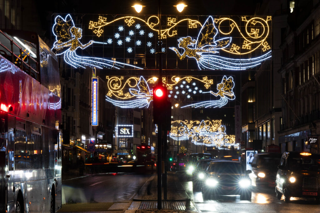 The Christmas lights on the Strand were unveiled last year, with the display paying homage to the Savoy Theatre, a landmark on Strand, which became the first public building in the world to be fully lit by electricity in 1881. This year’s Christmas lights London Strand installation features rows of two enchanting, illuminated fairy figures positioned on either side, flying through the air with glowing trails of light behind them.