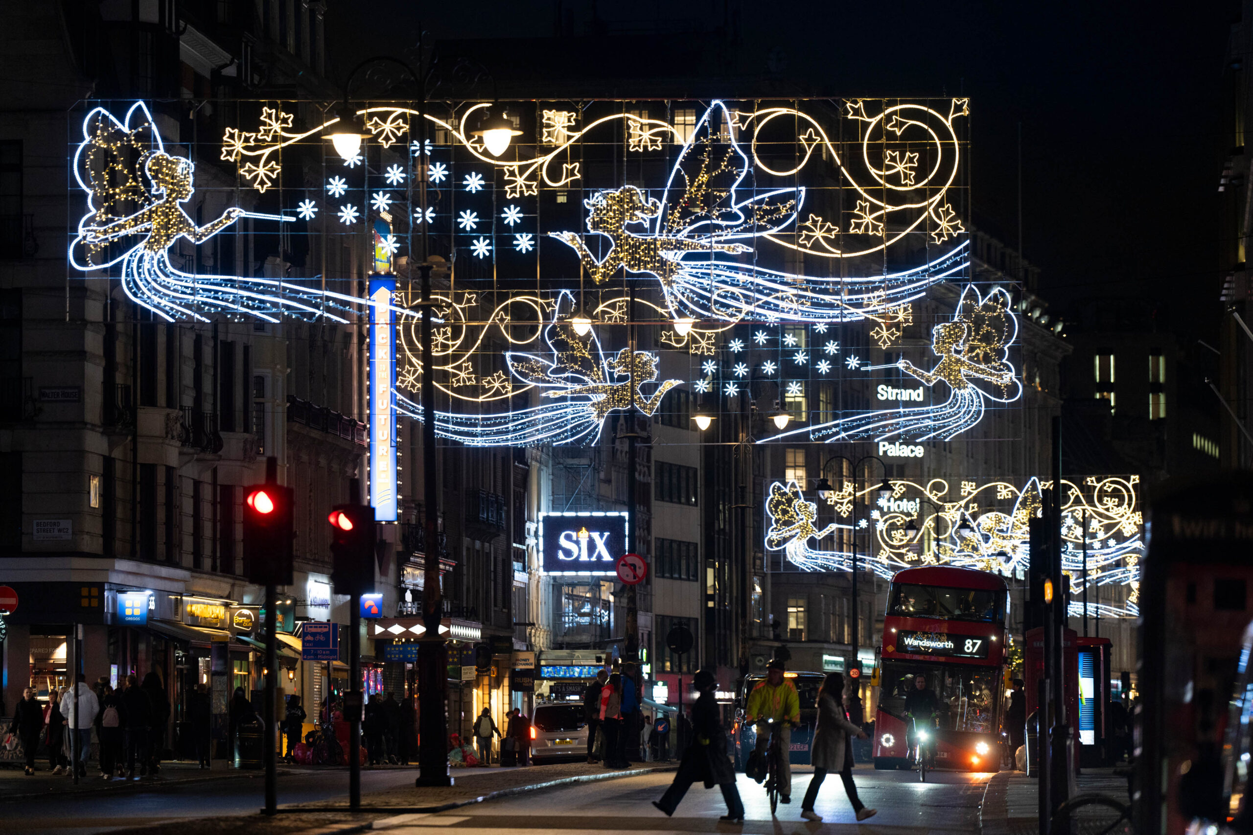 The Christmas lights on the Strand were unveiled last year, with the display paying homage to the Savoy Theatre, a landmark on Strand, which became the first public building in the world to be fully lit by electricity in 1881. This year’s Christmas lights London Strand installation features rows of two enchanting, illuminated fairy figures positioned on either side, flying through the air with glowing trails of light behind them.