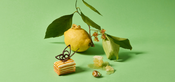 Beetroot Cherry Apple, a glossy cherry-red glaze reveals layers of blackberry and beetroot mousse, with a heart of lychee and finished with a yellow ladybird perched on a chocolate sable. Apricot Mille-Feuille, a crisp, caramelised puff pastry layered with apricot and honey compote created from the hotel’s rooftop beehives with a silky diplomat cream and a touch of apricot gel. Raspberry Magic Mushroom, a raspberry jelly and lemon foam, scattered with caramel tuiles and white chocolate spots.