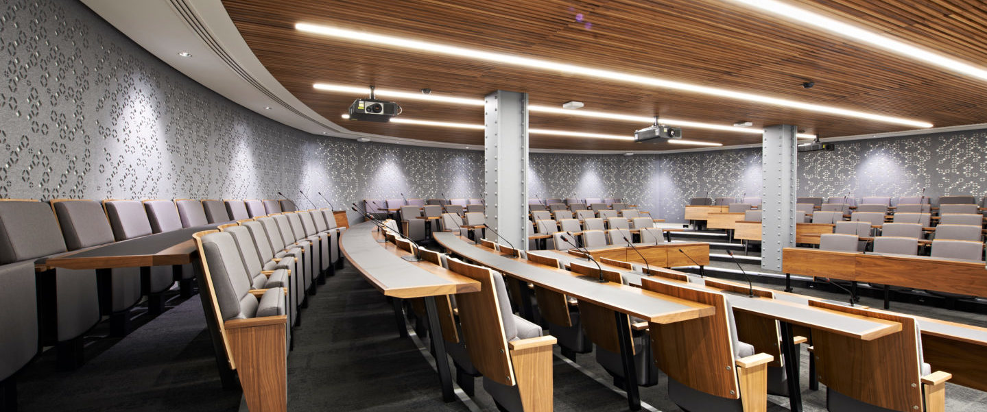 The state-of-the-art, Harvard style tiered lecture theatre can seat up to 120 delegates and boasts all the cutting edge AV facilities and extras an organiser could wish for. This includes 3 large screens, surround speakers and individual attendee desk mics, three syndicate rooms and a breakout space. Perfect destination meeting on one floor.